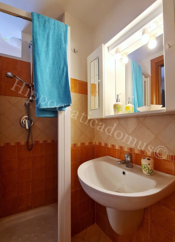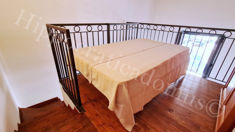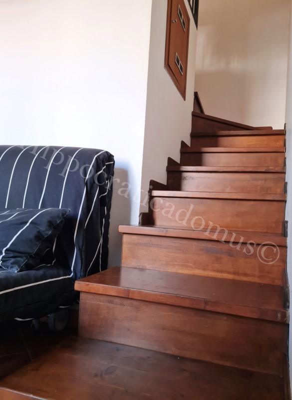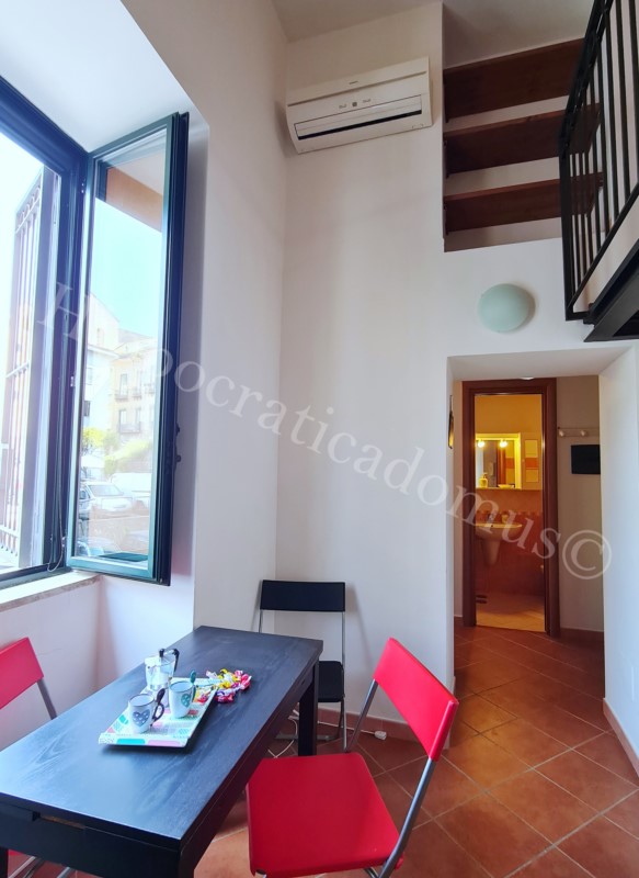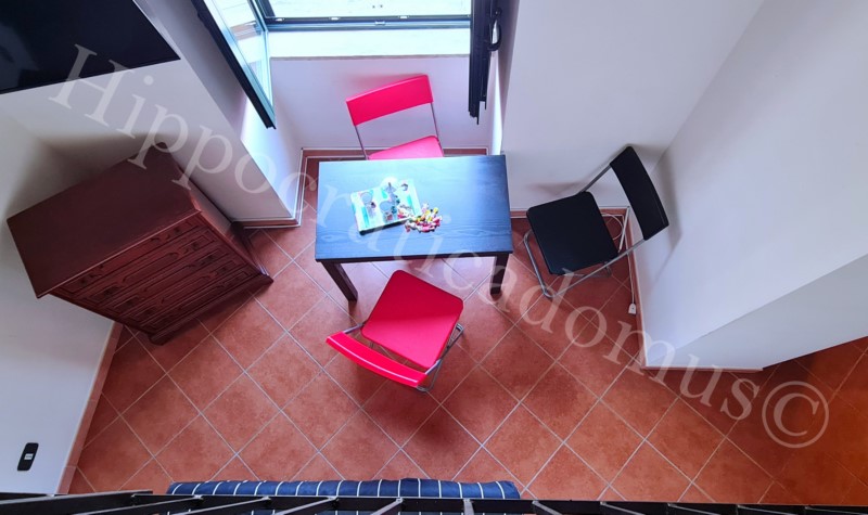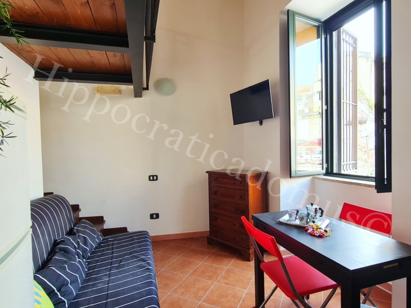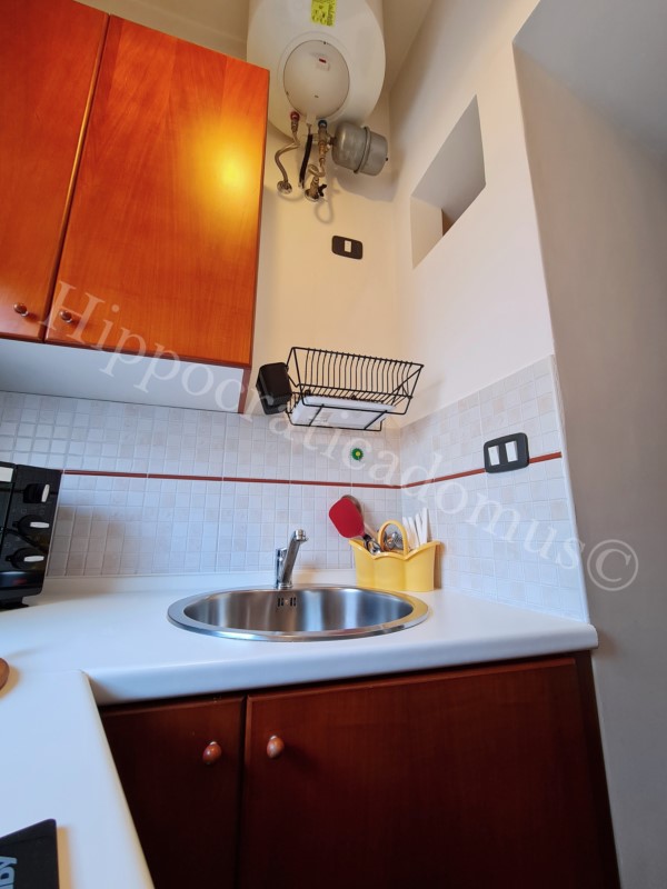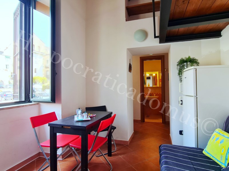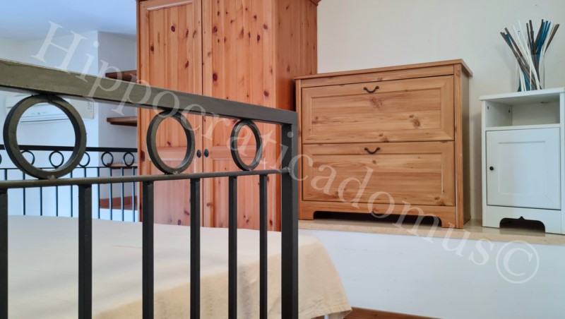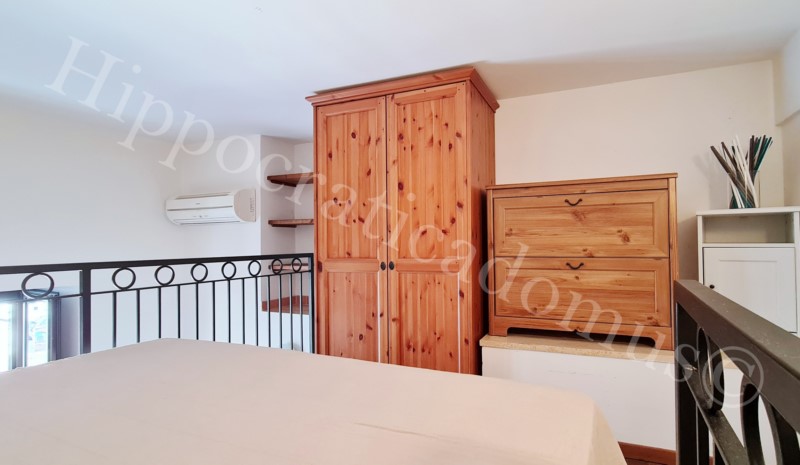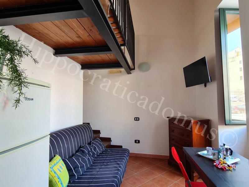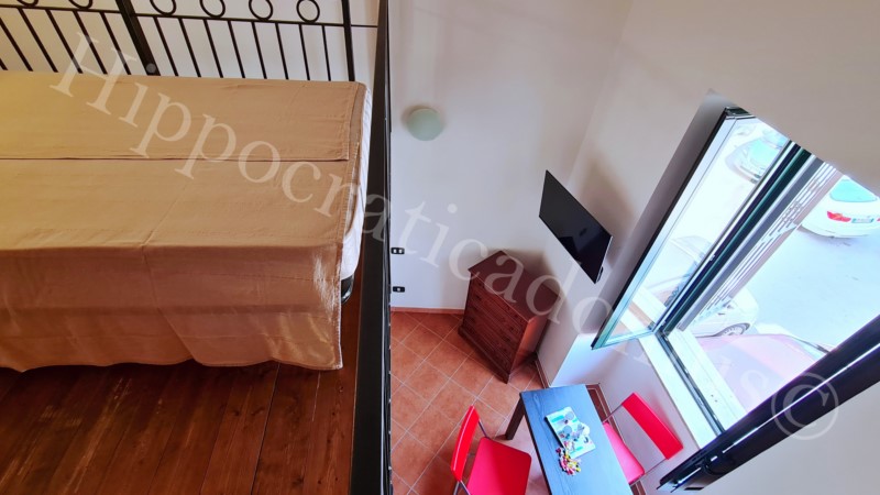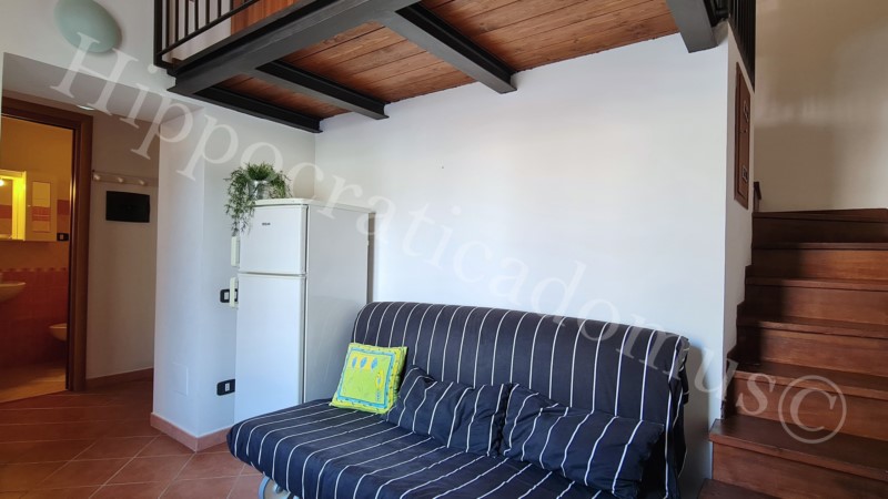 Il monolocale si divide tra ingresso, piccola zona fuochi, bagno con doccia, soggiornino e zona notte soppalcata. La soluzione è climatizzata ed arredata.